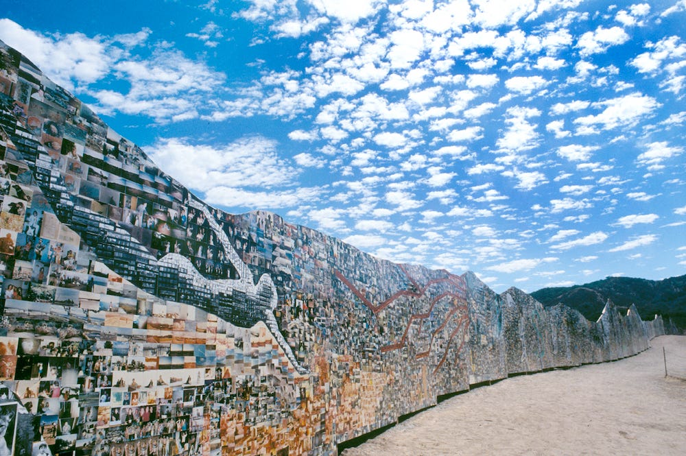 The Project’s largest and most dramatic phase was “The Tell,” a 636-foot long, 36-foot high photographic mural, constructed in 1989 by several hundred volunteers, in sight of the Irvine Company’s proposed Laguna Laurel [housing] project to be constructed in what is today the 7,000-acre Laguna Coast Wilderness Park. The name “Tell” comes from the archeological term for a mound of artifacts from prior civilizations, buried by natural elements.